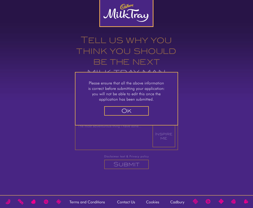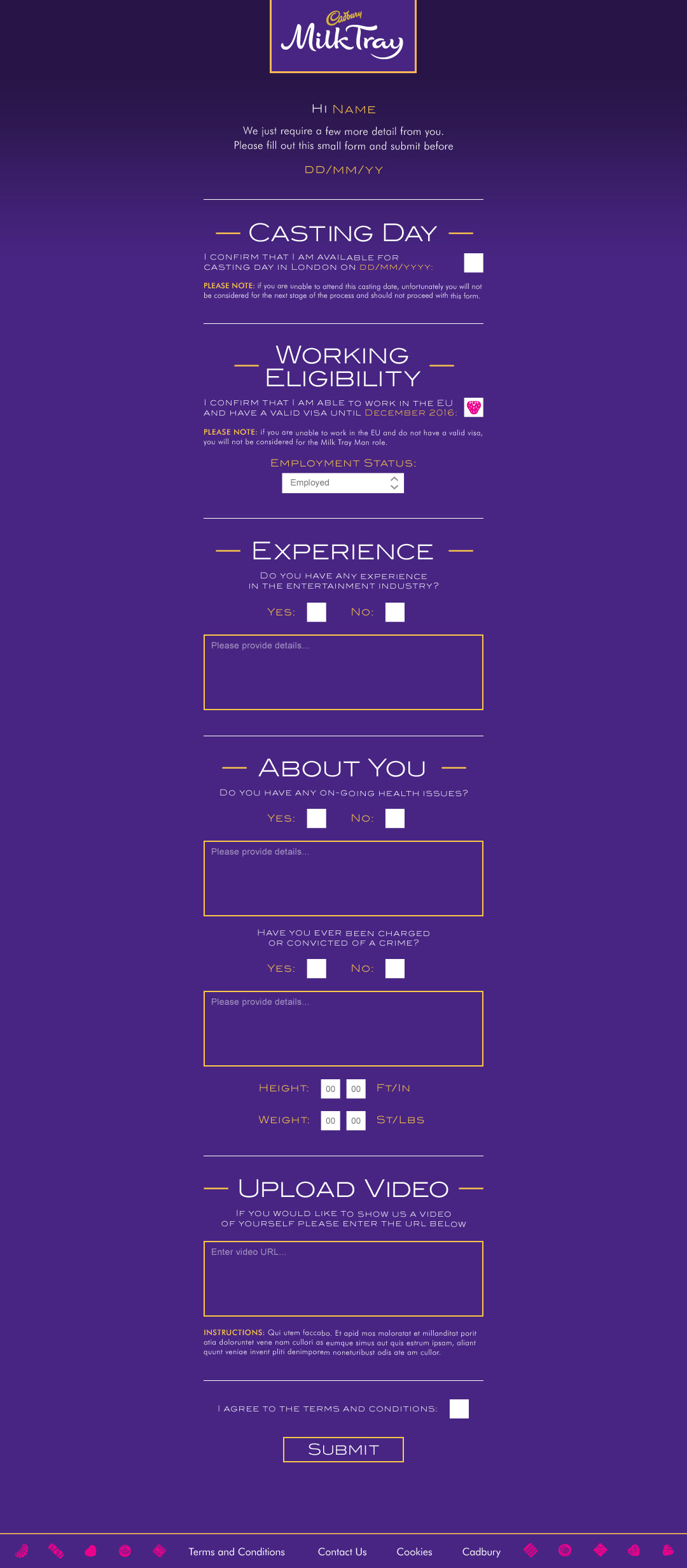Cadbury embark on their a highly successful, award winning campaign across digital and social platforms. Their quest is to search and to find the next worthy Milk Tray Man. Customers are invited to apply or to nominate through a multi-platform microsite for which we developed this tactile branded user experience. User experience is best viewed in sequence using the lightbox function. Agency: Elvis Direction: Neil Carding / Aldie Pretorius.